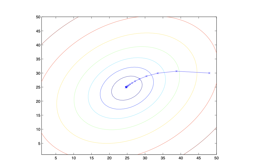 J(θ)의 꼴은 quadratic function(2차 함수)인 것을 알 수 있다. 따라서, 결괏값은 알고리즘의 최종 목표인 global optima에 도달한 게 된다.