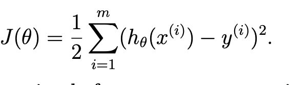 h(x)와 y값의 차이를 제곱하는 이유는 뒷 lecture에서 나올 예정이라고 함. 제곱, 절댓값, 루트 등 양수를 유지하기 위한 다양한 방법이 있긴 하다. 1/2은 제곱을 미분했을 때, 계산의 편의를 위해서 임의로 실수배를 해준 것이다.